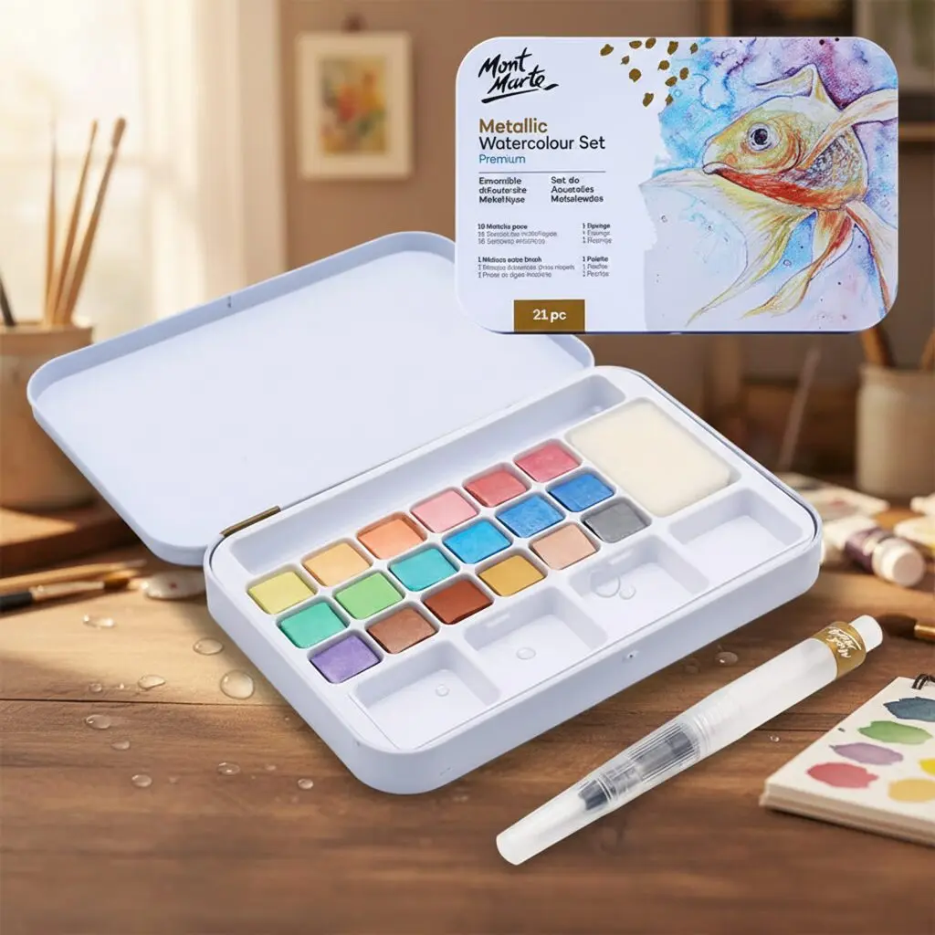 🎨 Discover the Mont Marte Metallic Watercolour Cake Set in Tin Premium 21 pcs — Your Go-To Metallic Watercolor Paint Set