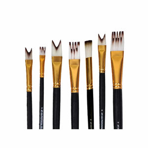 Special 7-piece set includes: 2 fan brushes, 2 angular brushes, 1 filbert brush, 1 deerfoot stencil brush, and 1 detail brush.