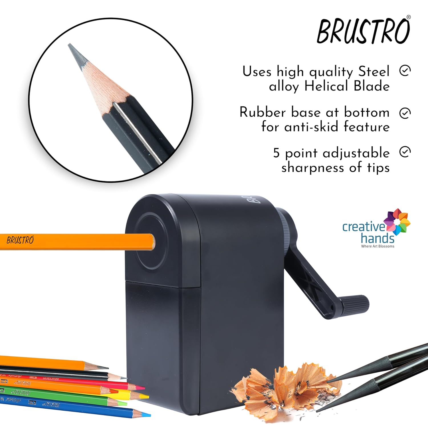 - Uses Steel alloy Helical Blade. Auto feed manual sharpener. Ideal for Charcoal pencils, Coloured pencil, Pastel pencil and Graphite pencil. Long points can be achieved. 5 point adjustable sharpness of tips. Anti-slip handle design. Rubber base at bottom for anti-skid feature. Built-in pencil tip grinder in the shavings bin. Large shaving Bin.