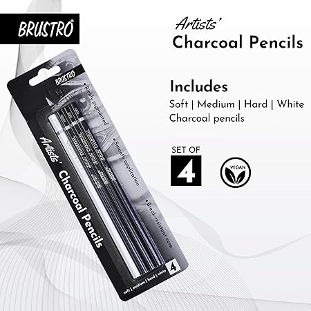 BRUSTRO Artists Charcoal Pencil Set of 4 (3 Black Shade – Soft, Medium, Hard and 1 White – Medium)