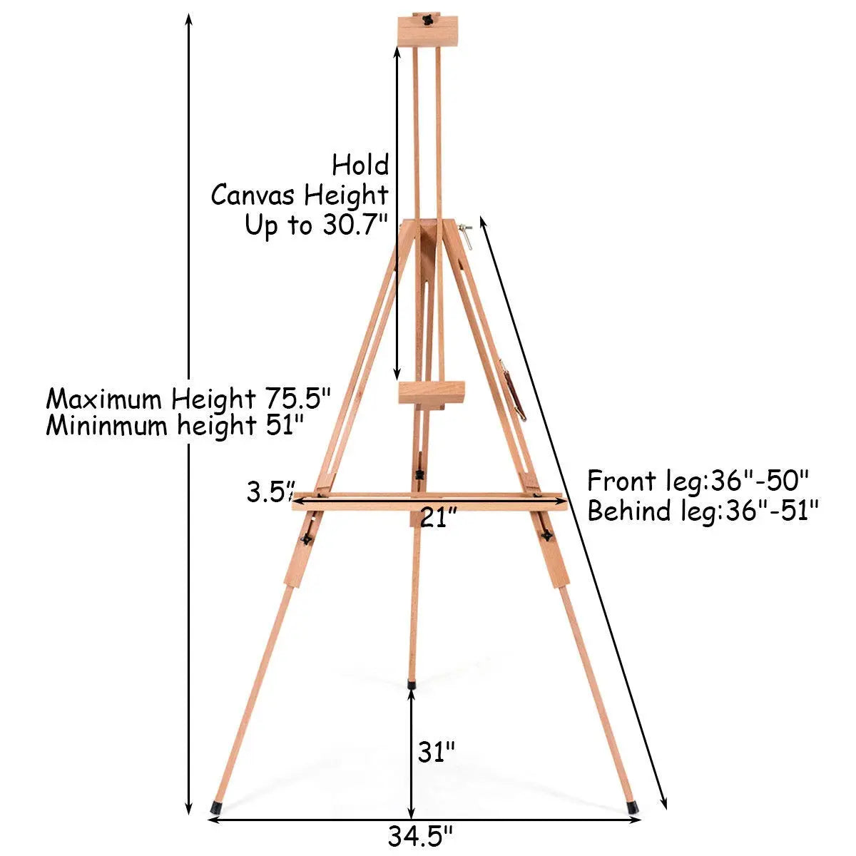 It has a tray for keeping your paints & brushes of 55cm x 9cm. It holds Canvases upto 76cm (30″) in height. Maximum extended height: 190cm (75”). Width of easel: 78cm (31″). Depth of easel: 78cm (31″), while the easel itself can fold to a convenient 92 x 13 x 10cm (36 x 5 x 4″) size for easy transport.