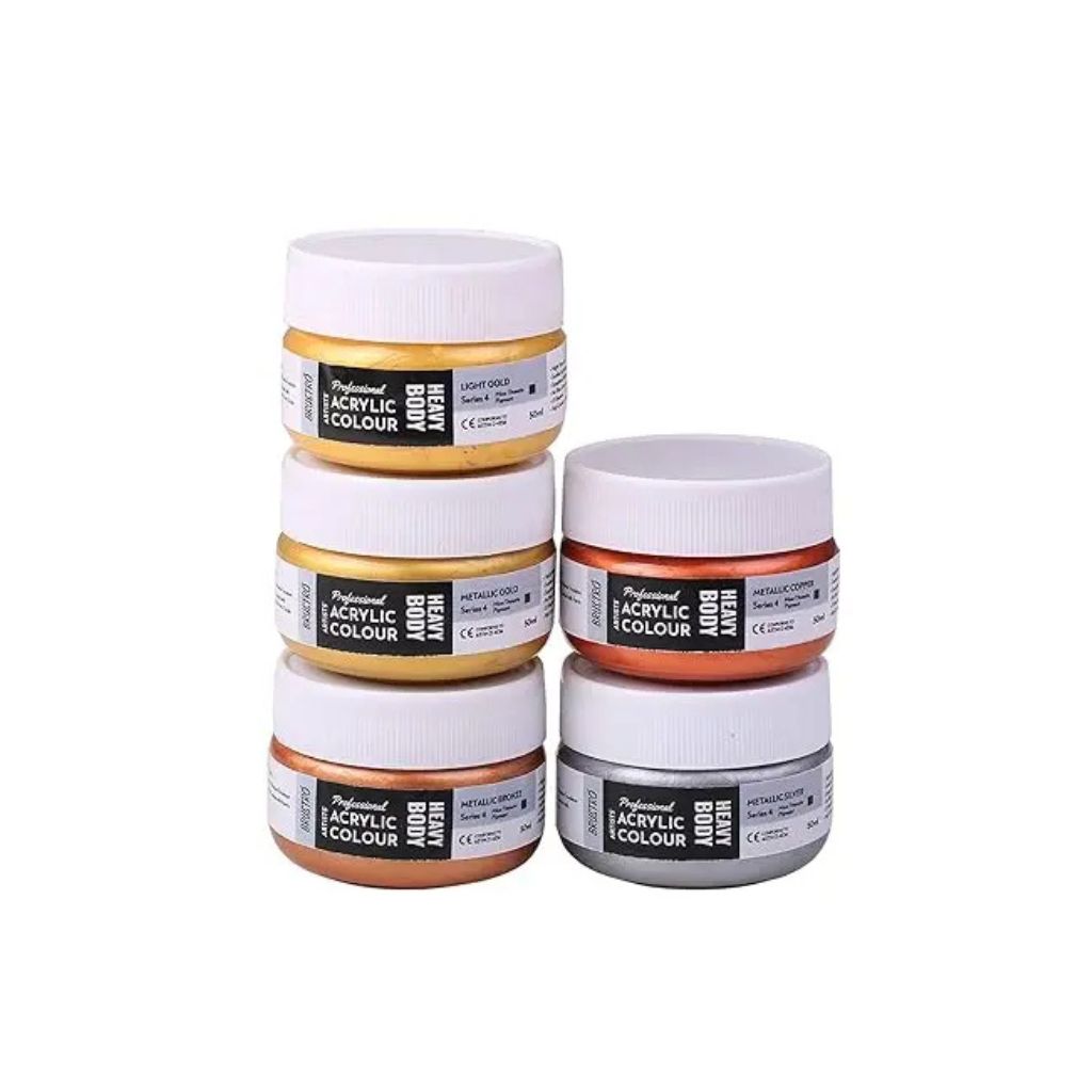 The Brustro Professional Artists’ Heavy Body Acrylic Paint Set Metallic Shades (50ml Pack of 5) is a premium acrylic paint set designed for artists who want rich, high-pigment metallic finishes. This metallic acrylic paint set for canvas painting delivers exceptional brilliance, texture, and coverage for professional artwork.Metallic Gold, Light Gold, Metallic Silver, Metallic Bronze, Metallic CopperThese premium metallic shades create a luxurious shimmering finish, perfect for highlights, texture work, and modern artwork.