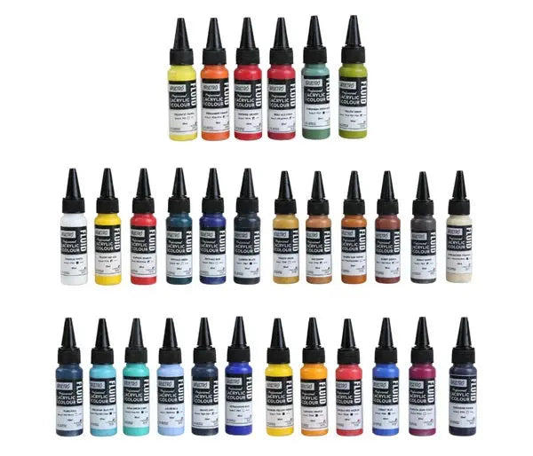 - Highly pigmented fluid acrylics with excellent lightfastness and vibrant brilliance.