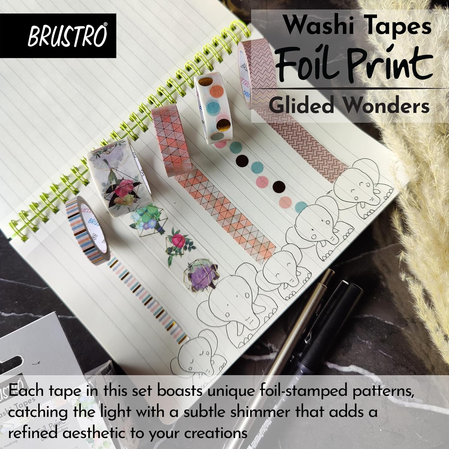 Premium foil print washi tapes with stunning glided designs for elegant detailing.