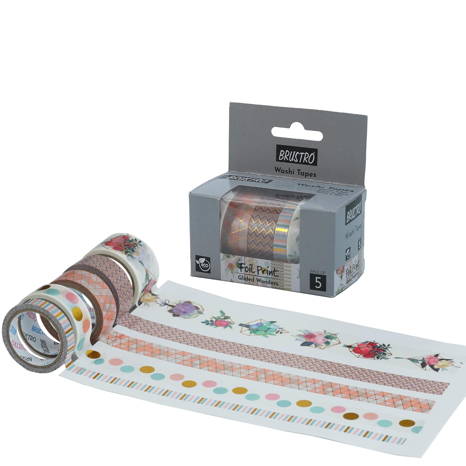 BRUSTRO Washi Tapes Foil Prints – Glided Wonders Shade, Set of 5. Designed for crafters, artists, and journal lovers, these eco-friendly washi tapes offer easy tearability, smooth application, and a beautiful foil finish that elevates every layout. Perfect for scrapbooking, card making, journaling, and decorative DIY crafts.