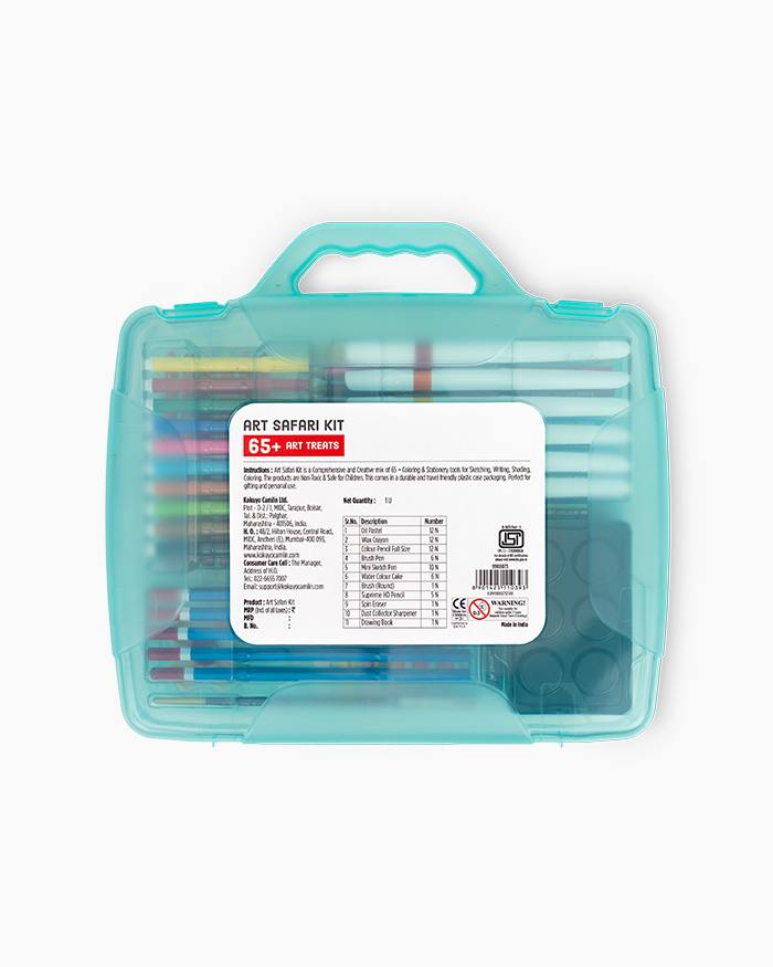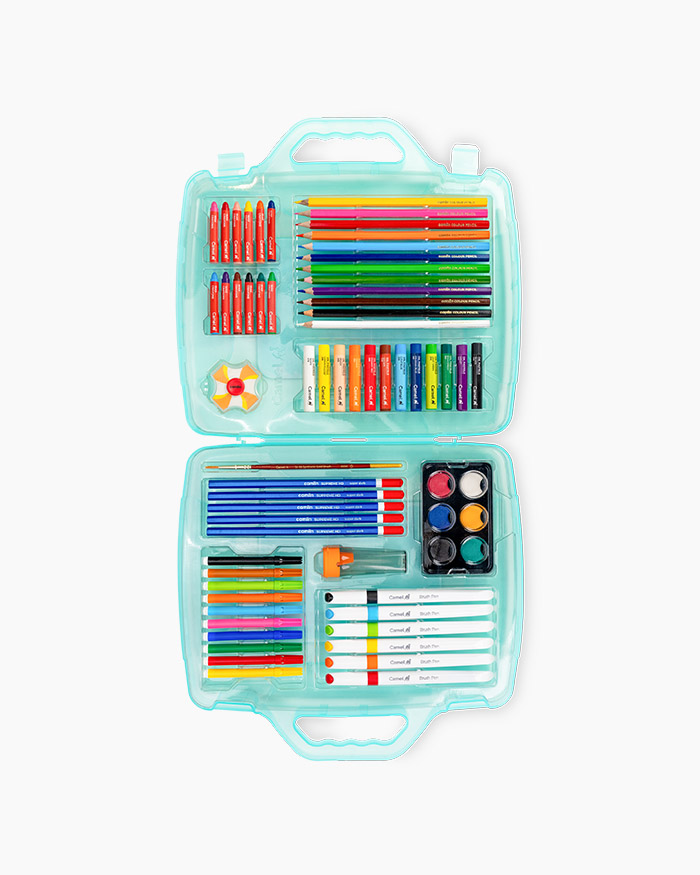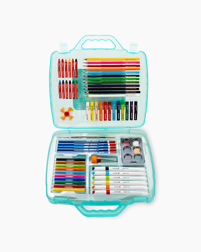 Includes a perfect mix of dry and wet mediums such as watercolour cakes, oil pastels, colour pencils, brush pens, and sketch pens