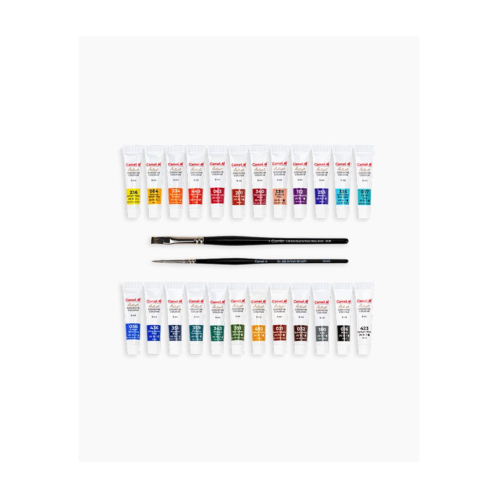 Camel Artist Gouache Colours 24 Shades 9ml Each with 2 Brushes + Free Premium A4 Sketchbook (270 GSM, 15 Sheets)