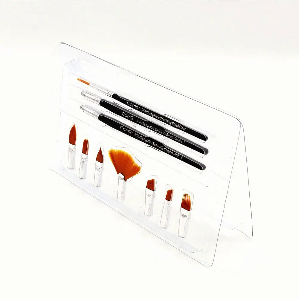 Camel Interchangeable Specialty Brush Set, designed for versatility and convenience. Perfect for poster, watercolor, and acrylic painting, this innovative set is ideal for artists of all levels, offering 1 liner brush handle and 7 interchangeable specialty brush heads.