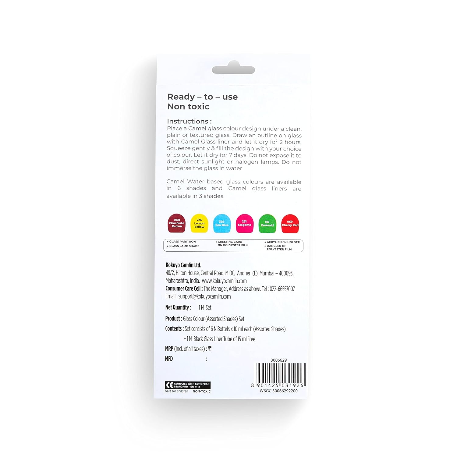 - Camel Glass Colours offers a vibrant assortment of 6 shades, each in a 10ml bottle, perfect for glass painting.