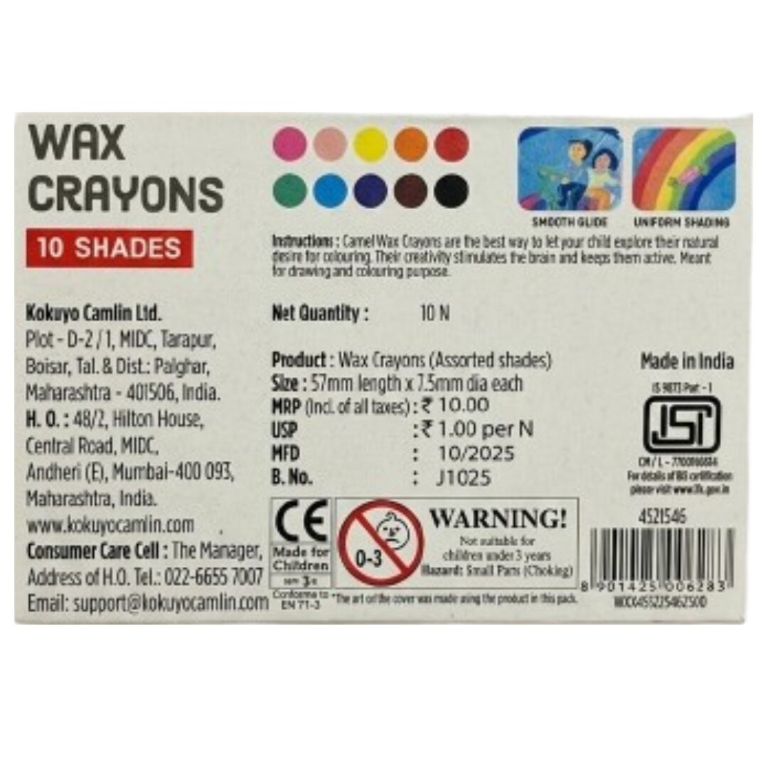 These Camel crayons 10 shades are made with high-quality wax pigments that glide smoothly on paper without scratching or breaking easily. The vibrant shades help kids explore their imagination while improving motor skills and creativity. Whether it is for school assignments, hobby coloring, or fun drawing time at home, Camlin wax crayons are one of the most trusted coloring tools for children in India.The crayons are easy to hold and specially designed for small hands, making them suitable for toddlers, preschoolers, and school-going children.strong wax formula prevents frequent breakage and ensures long-lasting use even with regular coloring. These crayons work well on drawing books, coloring books, and art paper, making them a reliable option for art and craft activities.