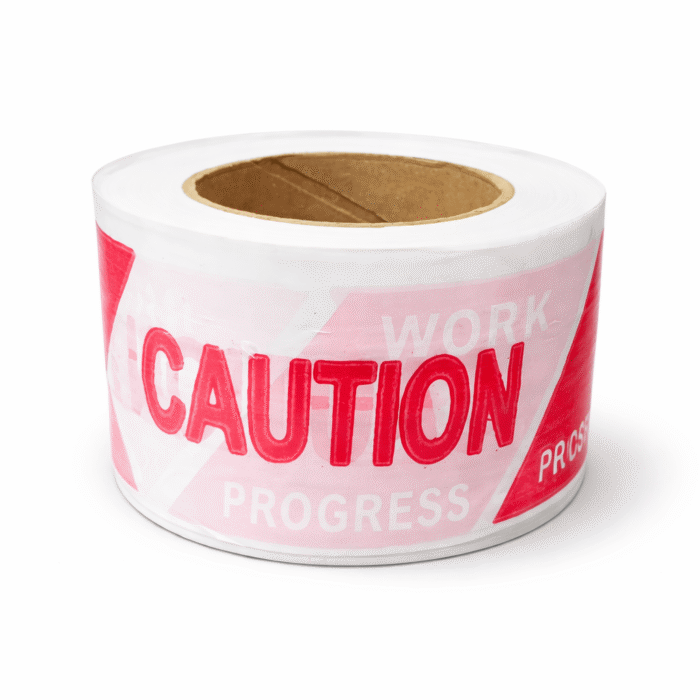 High-visibility white caution tape with clear “Work in Progress” warning print for effective safety communication