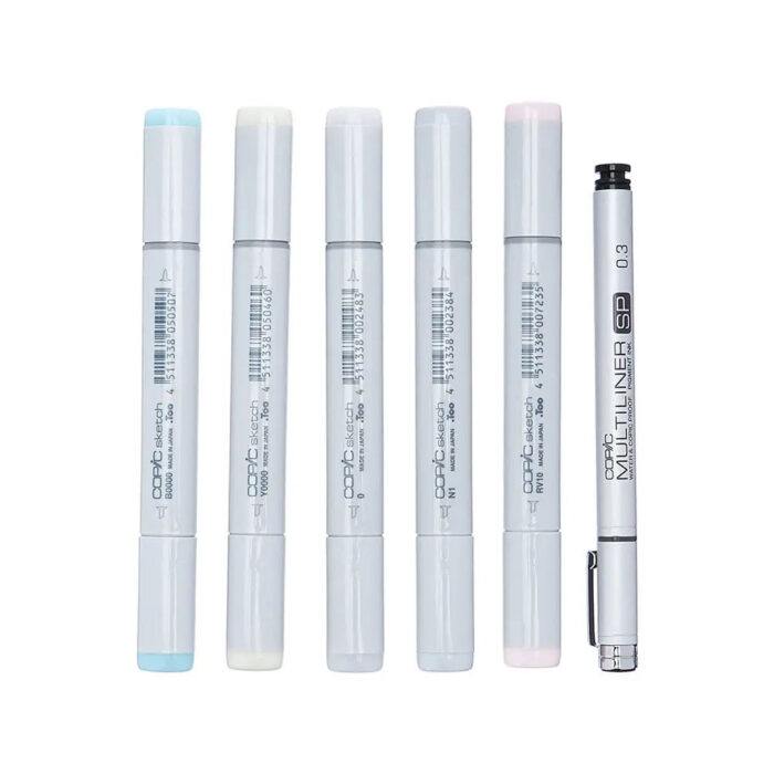 0 Colorless Blender, B0000 Pale Celestine, N1 Neutral Gray 1, RV10 Pale Pink, Y0000 Yellow Fluorite, and a 0.3 black Multiliner SP