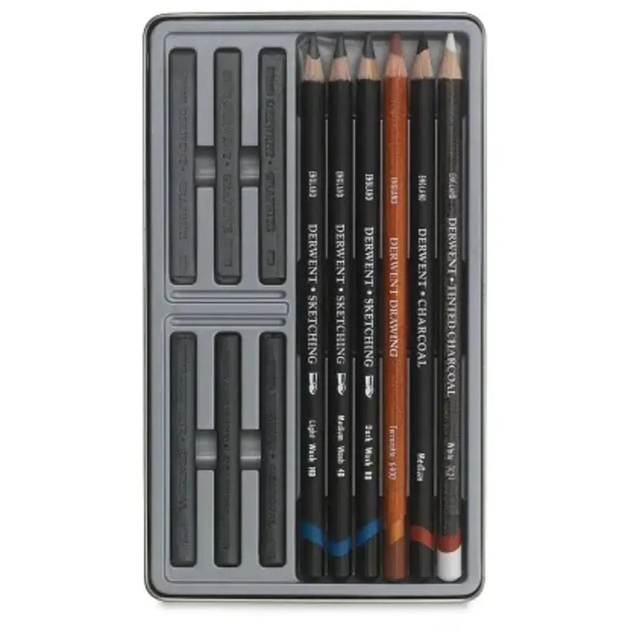 The Derwent Sketching Collection Tin Contains: 3 Graphite Blocks (Soft, Medium and Hard).3 Charcoal Blocks (Light, Medium and Dark).3 Water soluble Sketching Pencils (4B, HB and 8B).1 Drawing Pencil (Terracotta).1 Tinted Charcoal Pencil (White).1 Charcoal Pencil (Medium).