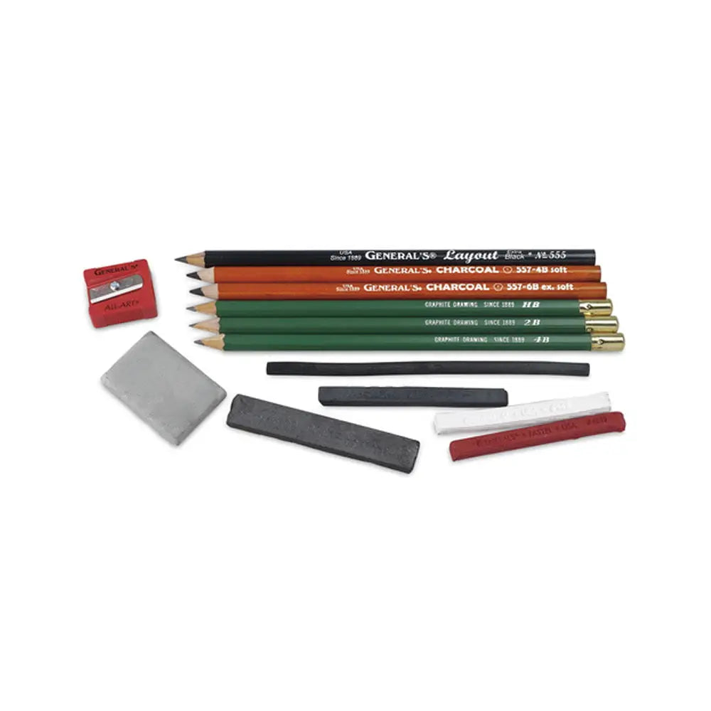 • 3 Kimberly Graphite Pencils (HB, 2B, 4B)• 1 Layout Pencil• 2 Charcoal Pencils (2B, 6B)• 1 Graphite Art Stick (6B)• 1 Compressed Charcoal Stick (6B)• 1 Sanguine Crayon• 1 White Pastel Crayon• 1 Medium Willow Charcoal•1 Kneaded Eraser• 1 Little-Red™ All-Art® Sharpener (S-650)