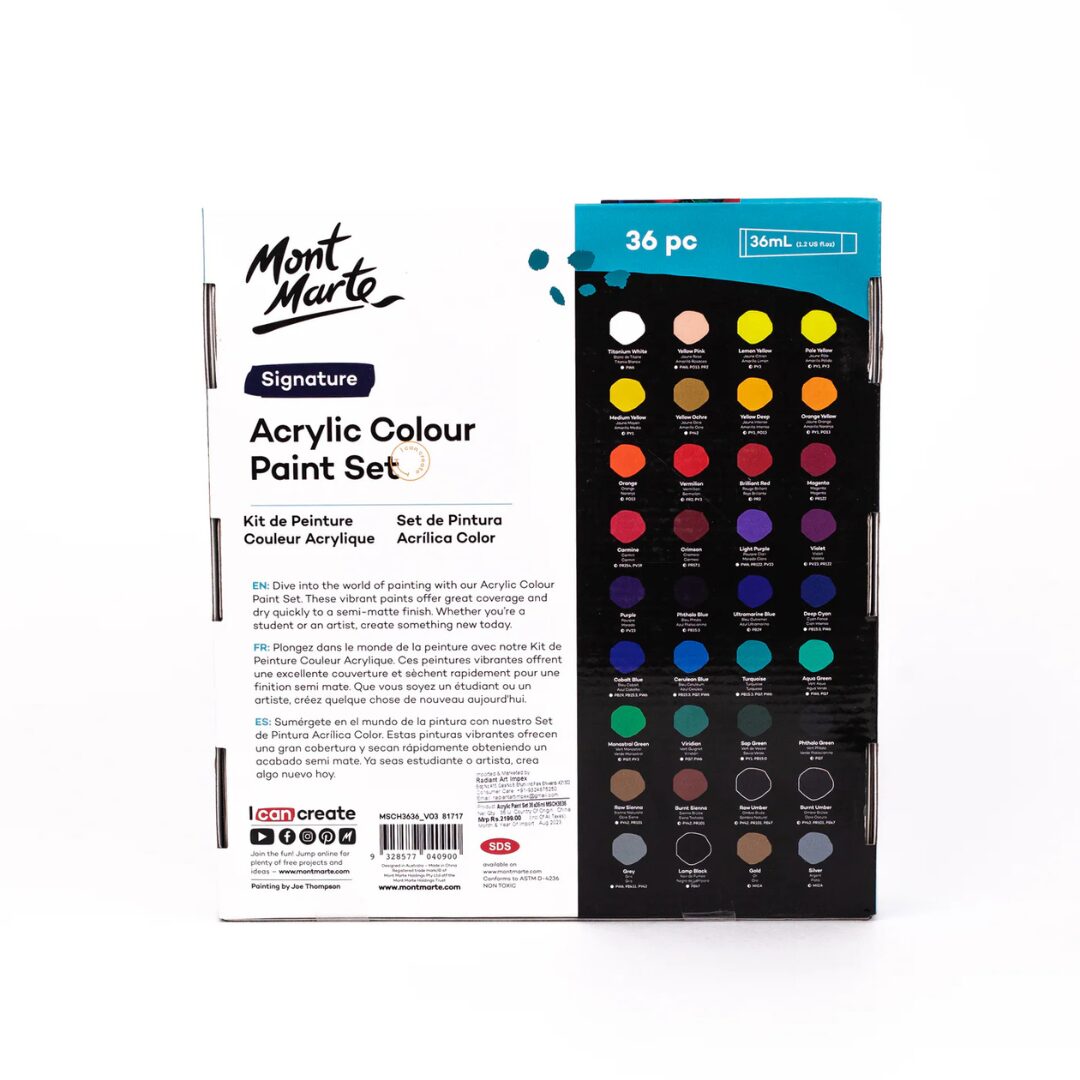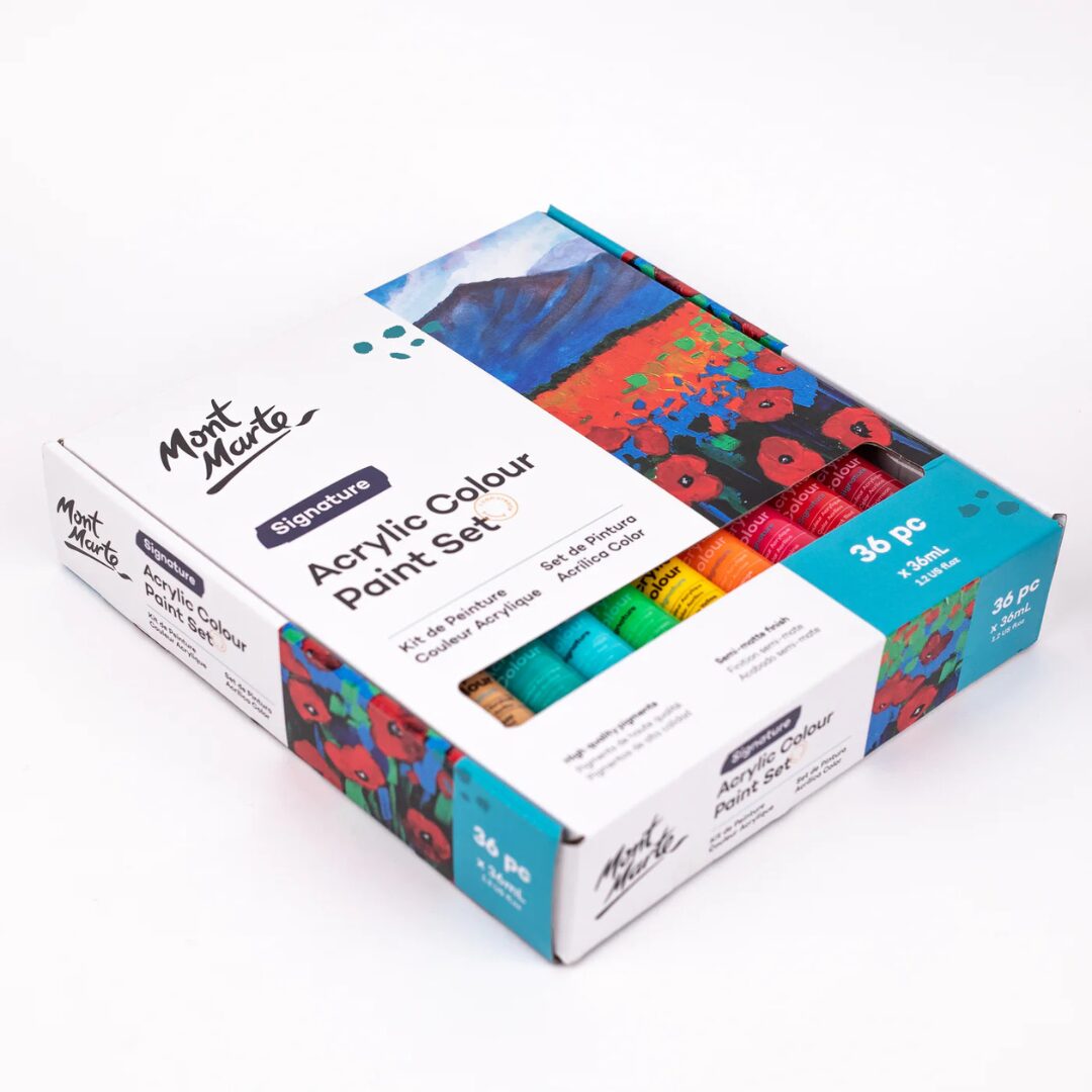 Premium Mont Marte acrylic paint set with 36 vibrant colours in 36ml tubes, ideal for artists, hobbyists, and students