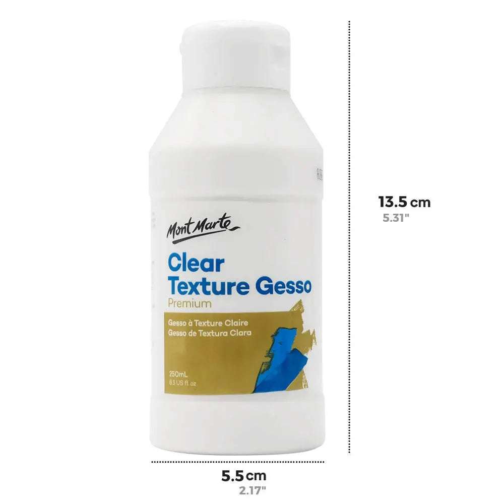 Mont Marte Premium Clear Texture Gesso (250ml) prepares surfaces with a transparent, professional-quality base for painting.