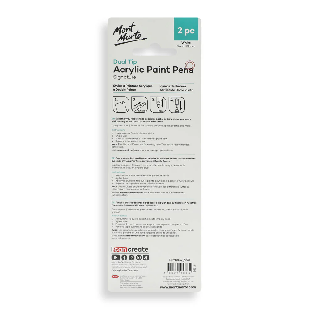 Mont Marte Dual Tip Acrylic Paint Pens – White (2-Pack)! These versatile acrylic markers offer rich, opaque white ink that works on multiple surfaces, making them perfect for artists, crafters, and DIY enthusiasts.