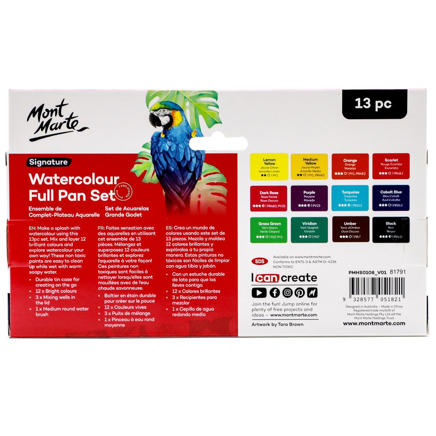 - Watercolour paint set Includes: 12 bright colours: Lemon Yellow,Medium Yellow, Orange, Scarlet, Dark Rose, Purple, Turquoise, Cobalt Blue, Grass Green, Viridian, Umber, Black, 3 mixing wells built into the lid and refillable round watercolour brush