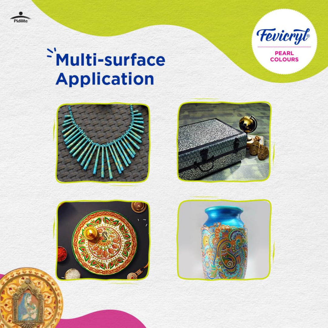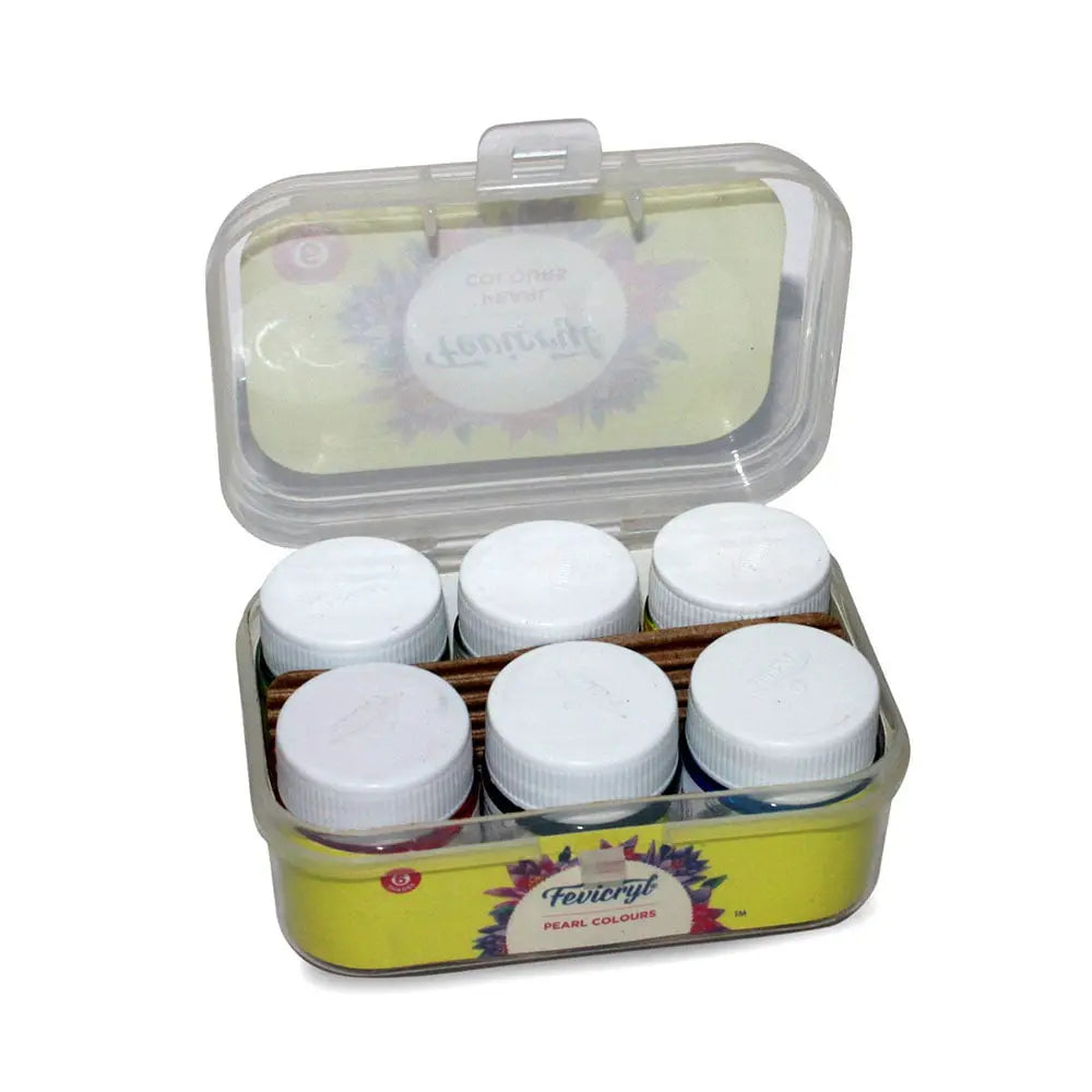 - Pidilite Fevicryl Pearl Colours Set of 6 offers six shimmering shades, perfect for adding a pearlescent touch to your art projects, crafts, and greeting cards.