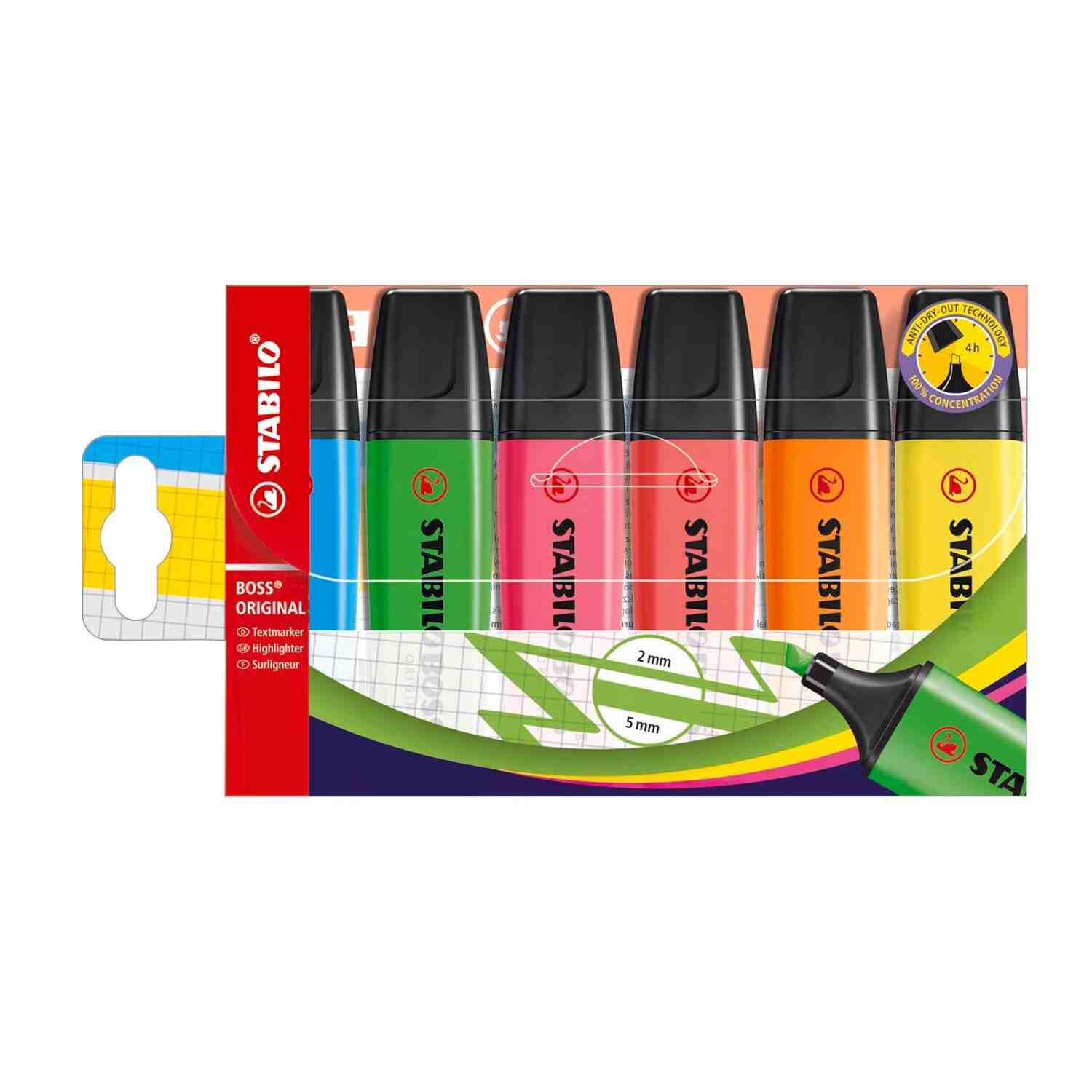 - There is only one Stabilo Boss Original, its unique and distictive shape is recognised all over the world and has been since 1971 and is Europe’s number one highlighter. The Stabilo Boss Original has super fluorescence ink, is an eye-catcher and fits perfectly in every pencil case. Its long life makes it the number one choice and stands for German quality you can trust. Don’t worry if you forget to replace the cap, you are able to leave it off for up to 4 hours and the highlighter will regenerate once the cap is replaced.