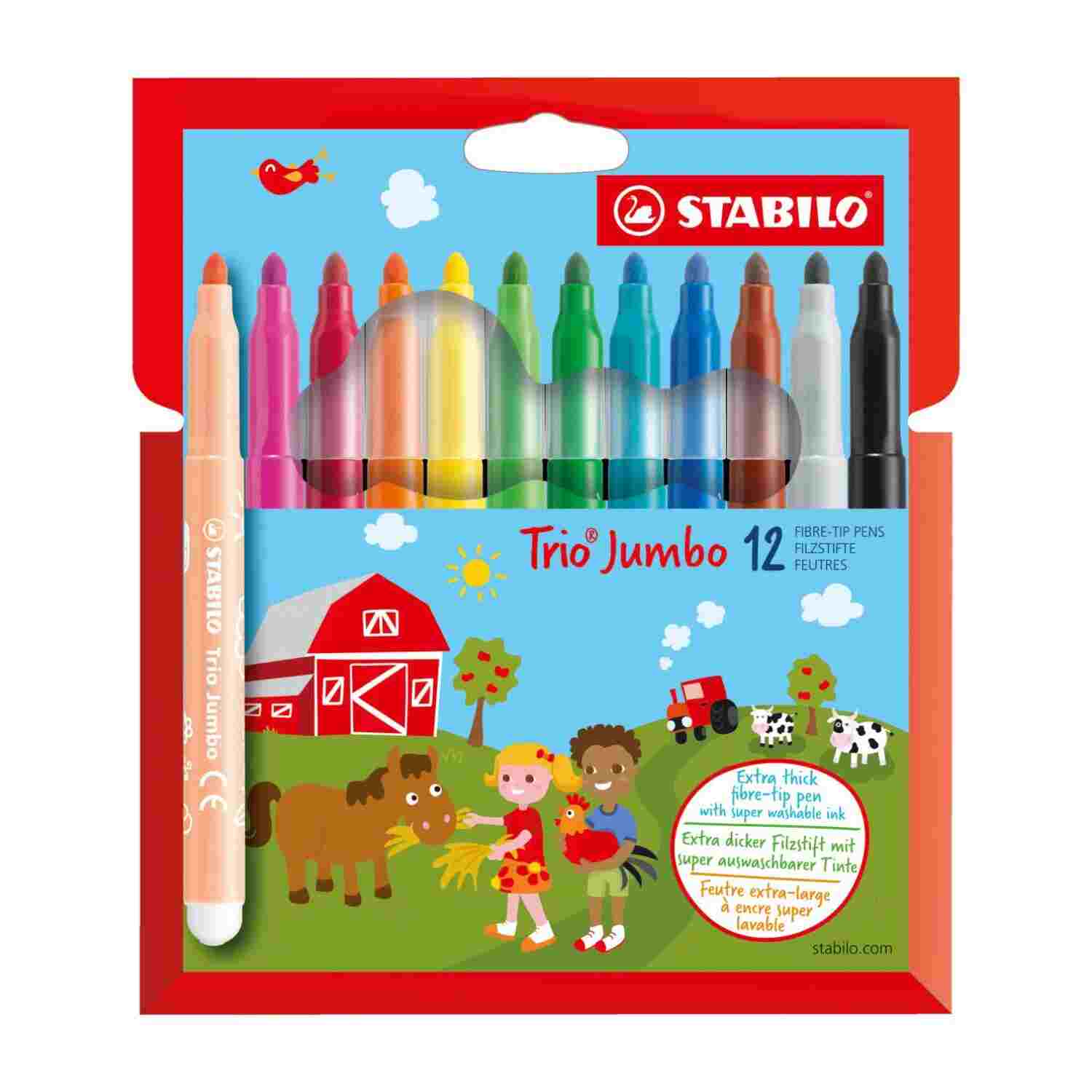 The extra-thick felt-tip pens STABILO Trio Jumbo in a cardboard wallet with 12 individual colors. You can find a list of color names and color numbers under Properties