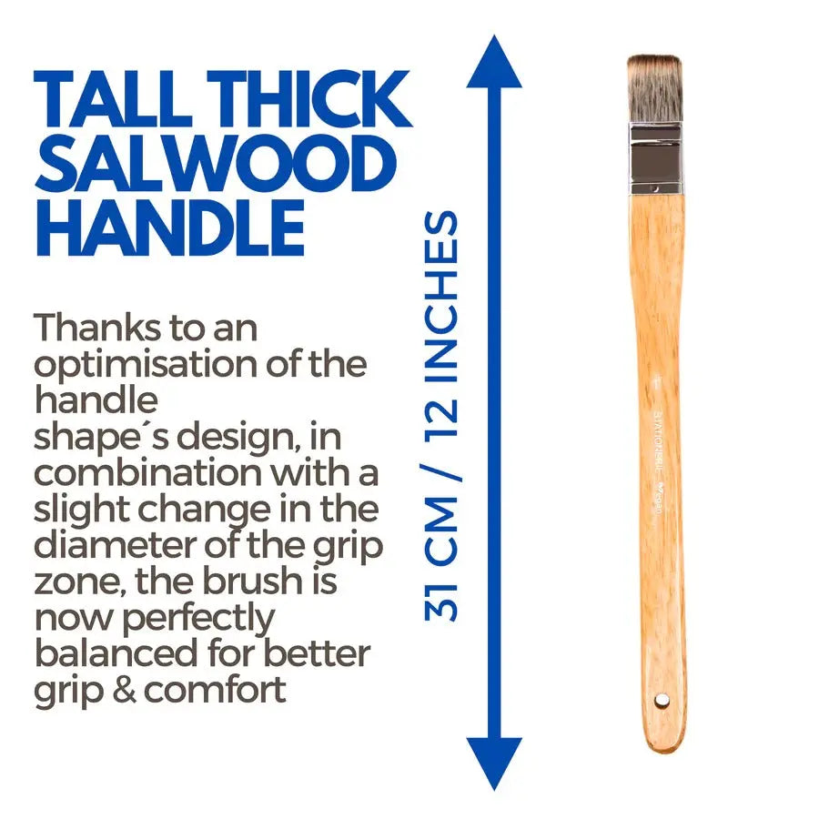 Super soft supreme quality goat hair is hand tied to a flat shape and sandwiched between two flat pieces of wood in a special long, natural wood paddle handle finished beautifully with a matt paint in dark blue colour .