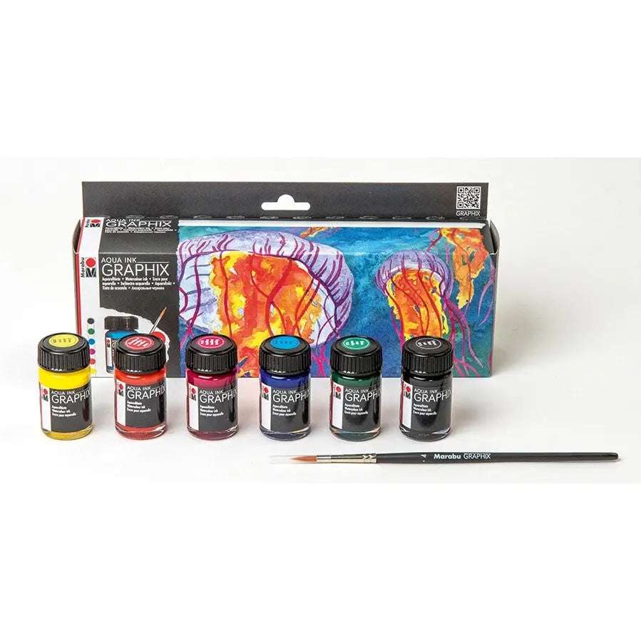 Marabu Graphix Aqua Ink – Starter Set Mc Floaty – Set Of 6 x 15 ML Bottle With Brush